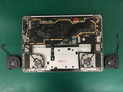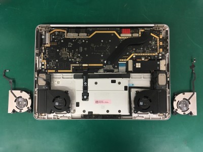 分解して内部を確認したところ、左右に搭載されているファンのうち、特に片側が劣化しており、軸ブレによる振動音が発生していました。